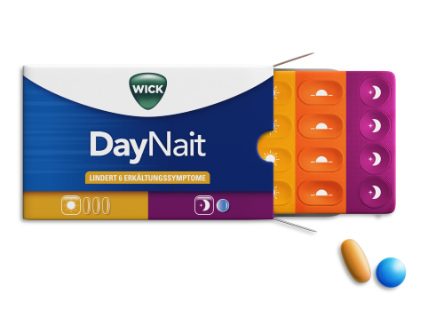 WICK DayNait Filmtabletten Anwendungsgebiete: WICK DayNait wird eingenommen zur kurzzeitigen symptomatischen Behandlung bei Verstopfung der Nase und der Nebenhöhlen, die mit Erkältungs- und grippeartigen Symptomen einhergeht, wie Kopf- und Gliederschmerzen und/oder Fieber, und nur in Kombination mit Schmerzsymptomen zur Schlafenszeit, die das Einschlafen erschweren. Ab 15 Jahren. Stand: Mai 2019.